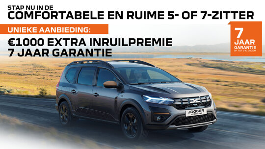 Kies vandaag voor een nieuwe Dacia Jogger en pak € 1000 extra inruilwaarde bovenop de inruilwaarde van uw auto. En met 7 jaar garantie bent u verzekerd van zorgeloos rijplezier. Liever Private Lease? U rijdt nu al een nieuwe Jogger voor € 343 per maand. Stap over. Stap in. Waar wacht u nog op?