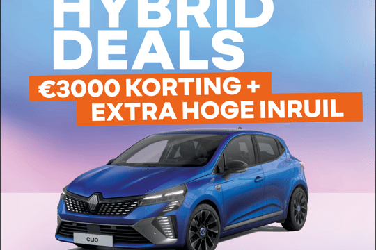 Kies vandaag voor een nieuwe Renault Clio en profiteer van € 3.000 korting! De actie is geldig op alle Renault Clio's, dus ook op de benzine aandrijving. Zo rijdt u de Renault Clio met benzine motor nu al voor € 22.490 in plaats van € 25.490. En de Renault Clio met hybride motor, die altijd is uitgerust als automaat, voor € 23.890 in plaats van € 26.890. Bekijk snel onze actievoorraad en profiteer.